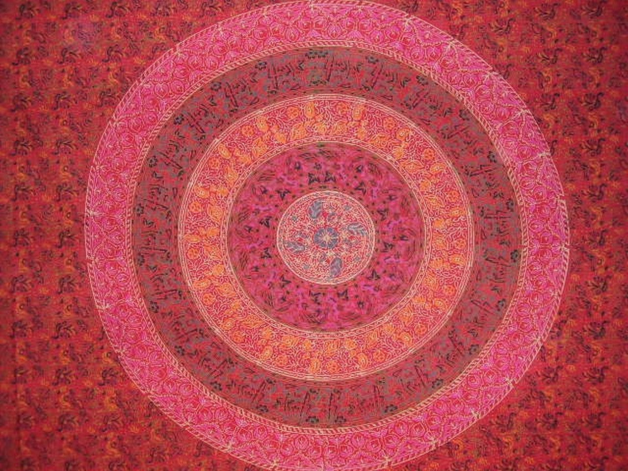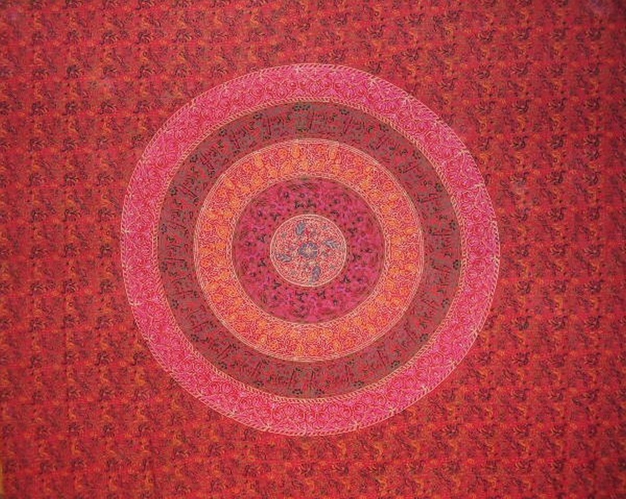 SANGANEER TAPESTRY ~ Gorgeous Queen Sanganeer hand block printed tapestry. Wonderful Mandala design in fire engine red background with jade green, tangerine, steel blue, black and tan accenting colors. Made of 100% power-loom cotton offering a strong, tight, durable weave. Measures approximately 108 x 108 inches. Can be machine washed separately on cool/gentle and tumble dried. The block printed textiles of Sanganer, India became famous in the 16th and 17th centuries in Europe when the East India Company began to export them in bulk. You have to appreciate the work that went into creating this lovely tapestry. Block Printing on textiles refers to the technique by which hand carved wooden blocks covered with dye are repeatedly hand pressed along the length of cloth to create a repeated pattern. Truly a work of art which can only be achieved by human hand, make this lovely tapestry a treasure to own. The Sanganeer styles are usually colorful floral patterns and known for their fine and intricate detailing. A lovely quality with endless versatility. Your Sanganeer block print tapestry can be used for: